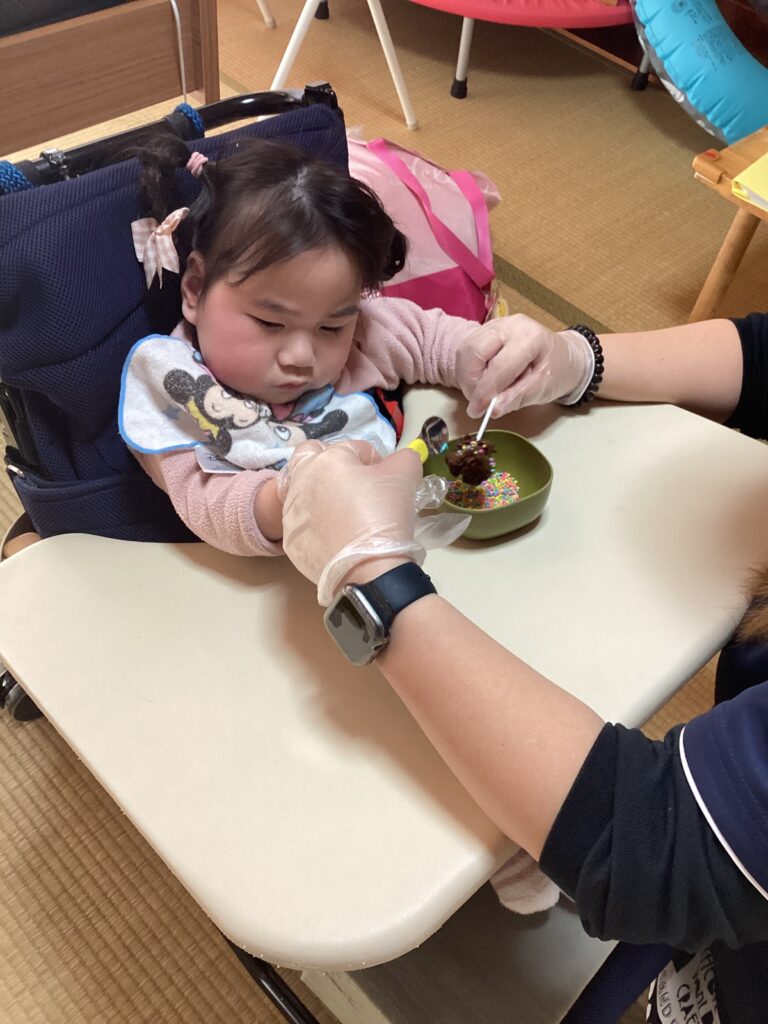 固まったチョコにカラースプレーでトッピングしていきます🎵